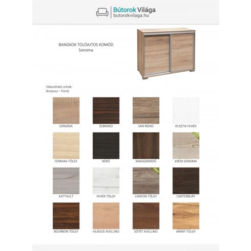 A Bangkok tolóajtós komód remekül illik a modern és letisztult stílusú helyiségekbe. Bal oldalán három belső fiók, jobb oldalán egy polc található, amely rendkívül praktikussá teszi a tárolást, hiszen akár kisebb, akár nagyobb ruhák, tárgyak tárolására is tökéletesen alkalmas. 16 féle színben rendelhető, így garantáltan megtalálja az otthonához leginkább passzoló kivitelt.