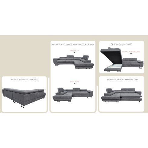 1 db ágyneműtartóval , 3 db állítható fejtámlával felszerelt. Térben is elhelyezhető, hiszen a hátulja is szövettel bevont.