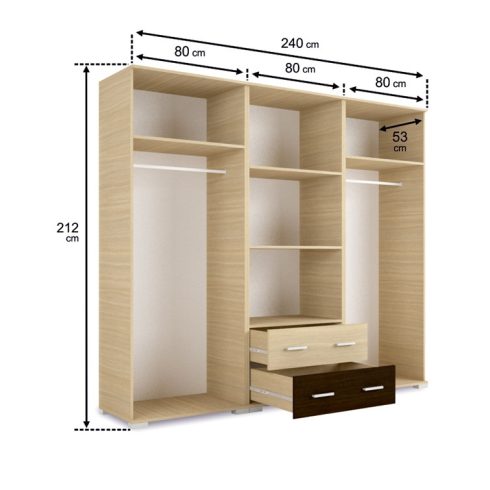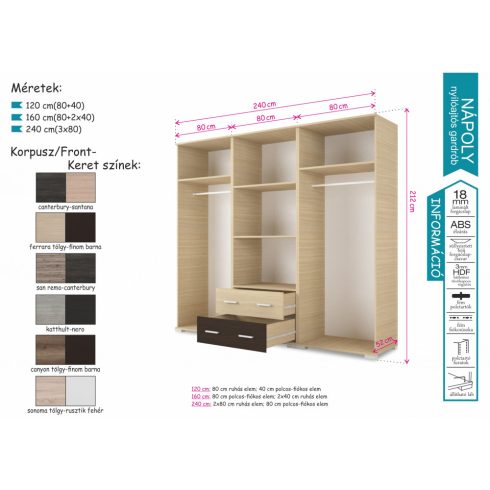 A Nápoly gardrób klasszikus stílusú, 7 féle színkombinációban készül. Tágas polcokkal, fiókkal és akasztós tárolóval rendelkezik, így a pakolás gyerekjátékká válik. Középen keretes tükör van.