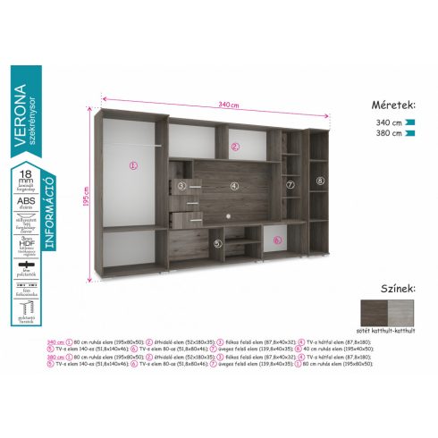 A Verona szekrénysor 340 cm-es kiszerelésű, amely laminált bútorlapból készül,