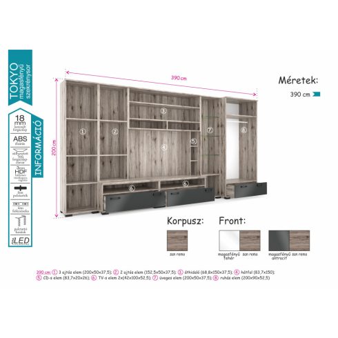 Tokyo szekrénysor, 8 elemből álló szekrénysor,  fehér vagy kék LED világítással, akár elemenként is. Szakértő munkatársaink által elemenként összeszerelten szállítjuk.