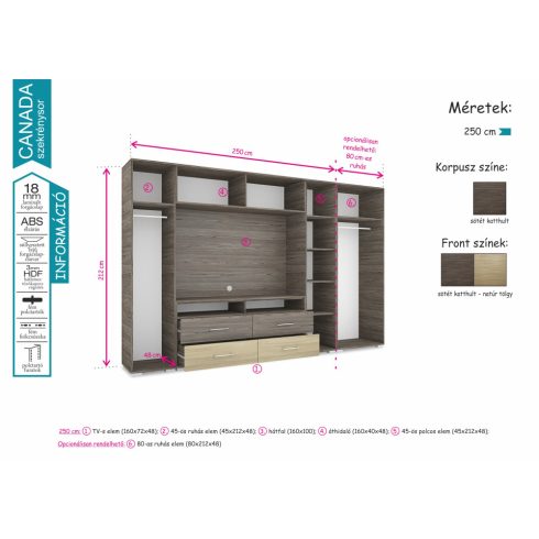 A Canada szekrénysor 250 cm-es változatban kapható. A kis tereket is otthonossá varázsolja.