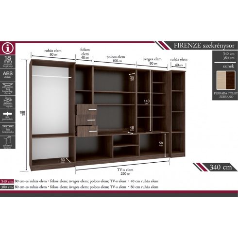 Az ÚJ Firenze szekrénysor modern stílusával tökéletes választás nappalijába. Az elemek belső kialakításának köszönhetően tökéletesen rendszerezheti benne a minden nap használt tárgyakat. Szélein klasszikus zárt szekrényekkel, középen TV-s elemmel és nyitott polcokkal készül. Az Új Firenze 340 cm-es szekrénysor elemei: 80 cm-es ruhás elem - fiókos elem, üveges elem, polcos elem, TV-s elem - 40 cm-es ruhás elem.