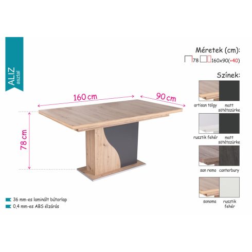 A pácolt lakkozott bükkfa láb a fa természetességével teszi stílusossá az étkezőt. Az Aliz asztal termékünk 160 cm-es méretben, bővíthető vendéglappal kapható. A vendéglapot behelyezve a lábbal megegyező színkombinációt kapunk.