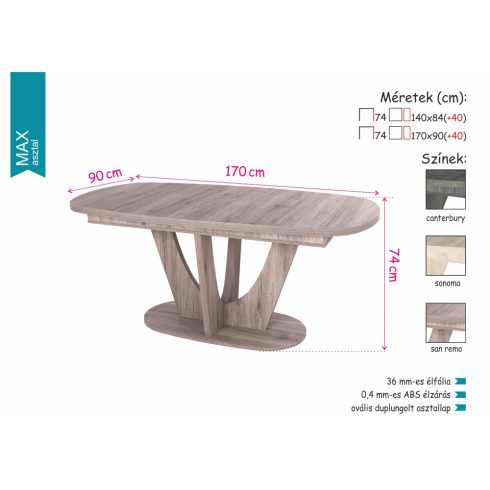 Ha az étkezőben központi szerepet szán asztalának, kitűnő választás lehet a Max asztal. A lekerekített formavilág és trendi megjelenés időtálló, stabil kialakítással társul. A Max asztalunkhoz vendéglap is tartozik, amely segítségével további 40 cm-rel bővíthető az asztal felülete.