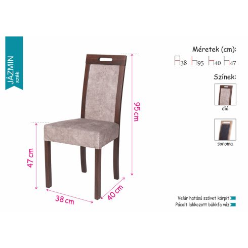 A Jázmin szék pácolt lakkozott bükkfa vázzal és puha velúr hatású kárpittal egy nagyon különleges szék.