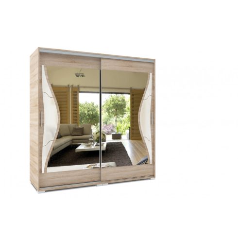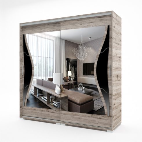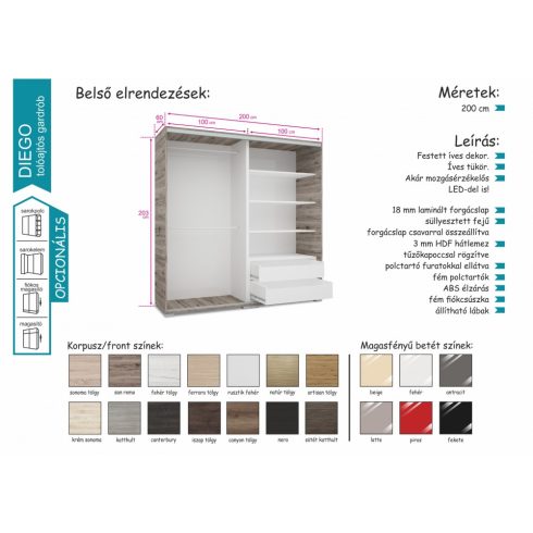 A Diego tolóajtós gardrób trendi és modern stílusát még inkább feldobja a középen elhelyezett, egyedi vonalvezetésű tükör. Massziv szerkezetű, belül tágas akasztós, polcos és fiókos elrendezéssel készül, így rendkívül kényelmes benne a pakolás.