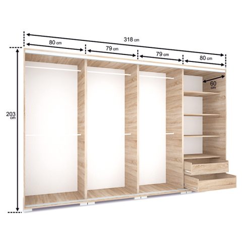 A Bond gardrób magasfényű betéttel 318 cm egy rendkívűl masszív szerkezetű gardróbszekrény, amely ideális választás a letisztult és modern lakberendezés híveinek. Tágas polcokkal, fiókokkal és akasztós tárolóval rendelkezik, így a pakolás gyerekjátékká válik.