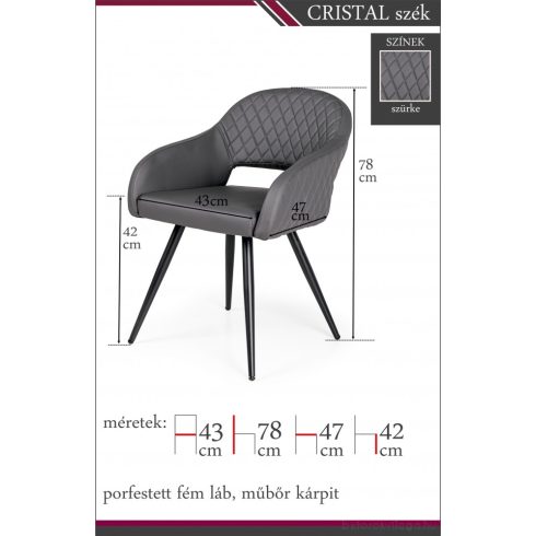 A Cristal szék szuper választás, legyen szó egy modern konyháról, vagy egy letisztult stílusú nappaliról. A fekete porfestett fém lábakkal és steppelt műbör kárpittal készült székek szinte minden berendezési stílushoz tökéletesen illenek. Anyagának köszönhetően rendkívül könnyen tisztán tarthatóak, így új bútor hatását keltik évek múltán is.
