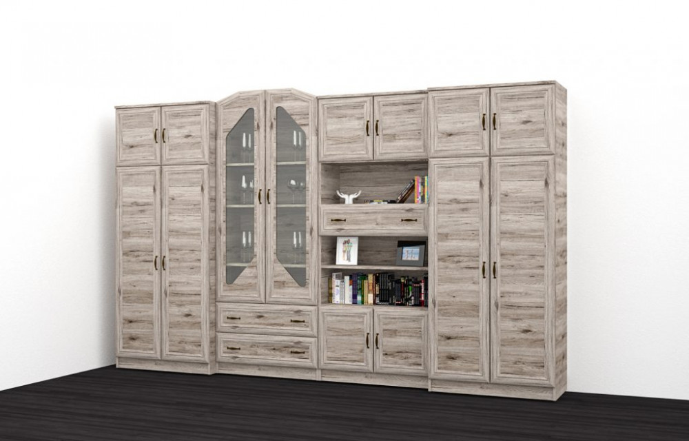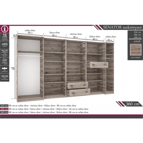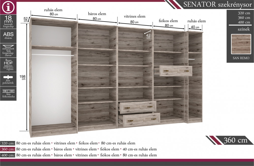 A Senator 320 cm-es szekrénysor elemei: 2 db 80 cm-es ruhás elem - vitrines elem - fiókos elem.