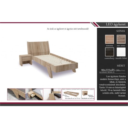 Leo ágykeret fiatalos modern formavilágú, amit a lábak, és fejtámla vonalvezetésének köszönhet. Tartós 18 mm-es bútorlapból készül, 38-as laminált lábai szintén erős, stabil tartást biztosít.