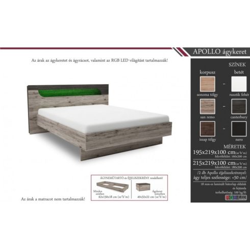 Apollo ágykeret 160 cm. Háromféle csodálatos színben rendelhető modern megjelenésű ágykeret. 18mm-es laminált bútorlapból készül, beépített RGB LED világítással. Az ár a matracot nem tartalmazza. Opcionálisan rendelhető az ágykerethez éjjeliszekrény és ágyneműtartó!