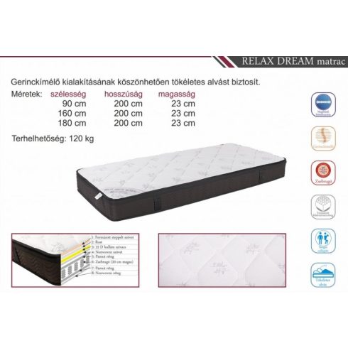 Relax Dream matrac 180 cm. Gerinckímélő kialakításának köszönhetően kényelmes alvást biztosít. Zsebrugós, formázott felső szivacsréteggel rendelkezik. Rezgéscsillapító réteg és megfelelő háttámasz jellemzi. Háromféle méretben rendelhető termék.