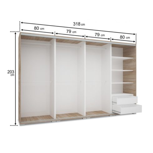Lux 318 cm-es gardróbszekrény. Egy modern gardróbszekrény, tágas színválasztékkel. Tökéletes választás nappalijába, hálószobájába. Remek formatervezésű tolóajtós gardróbszekrény. 18 mm-es laminált faforgácslap, ABS élfóliával zárva, süllyesztett fejű forgácslapcsavarral összeszerelve. A hátfal 3 mm-es HDF lemez, tűzőkapoccsal rögzítve. A polcok fém polctartókkal rögzítettek. A fiókok fémcsúszkával szereltek.