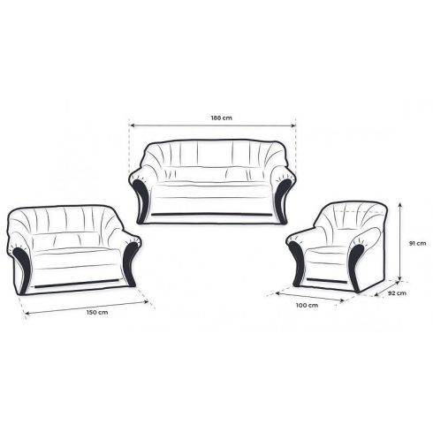 külső méret: 150 × 92 cm, háttámlamagasság: 91 cm, ülőmagasság: 43cm, beülőmélység: 57 cm