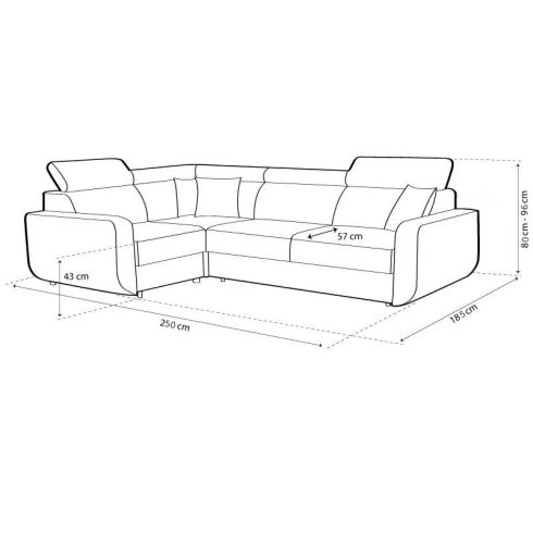 külső méret: 250 x 185 cm, fekvőfelület: 190 x 125 cm, teljes magasság: 80/96 cm, ülőmagasság: 43 cm, beülőmélység: 57 cm, háttámla magasság: 68 cm