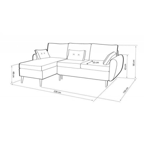 külső méret: 228 x 156 cm, fekvőfelület: 200 x 140 cm, ülőmagasság: 48 cm, beülőmélység (párnával): 55 cm, háttámlamagasság: 43 cm, teljes magasság: 90 cm
