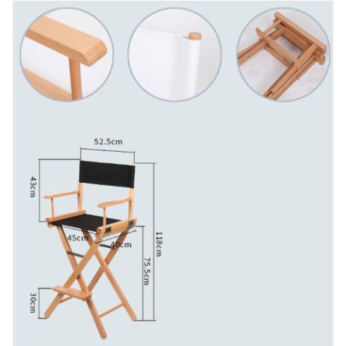 Kényelmes sminkes/rendezői szék, lábtartóval és karfával szerelve. Összecsukható.Összecsukható kialakításTeljes magasság: 118cmÜlőfelület magassága: 75.5cmÜlőfelület szélessége: 45cmÜlőfelület mélysége: 40cmSzélesség: 52.5cmLábtartó magassága: 30cm