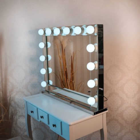 A HW-DC117-7 Hollywood sminktükör, amivel feldobhatod fésülködő asztalod. A LED tükör biztosan a szobád vagy smink, haj, stb. stúdiód hasznos és dizájnos kelléke lesz. 14db 3W teljesítményű LED izzóval. A fényerő állítható. Az izzók mögötti felület szintén tükörből készültek. Talppal, de falra is felszerelhető.Tükör mérete: 80x65cmIzzó méret: 60mm (E27)Talp színe: ezüstSúlya: 10kg