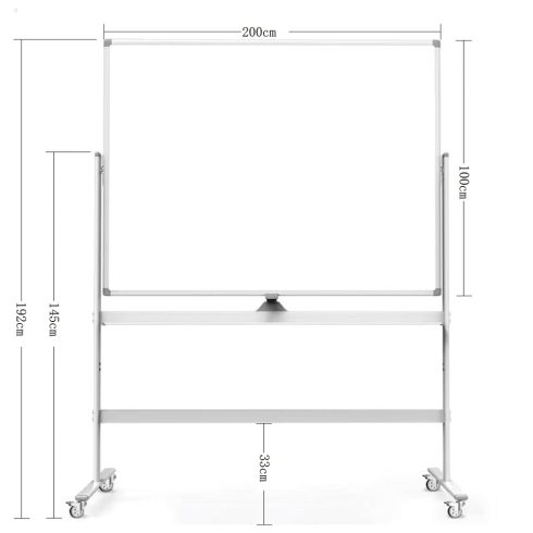 A mágnestáblákat nem csak oktatási célra, de irodákban is előszeretettel használják. A hagyományos táblákkal ellentétben környezetbarát, és nem keletkezik krétapor sem. A táblán található markertartó áthelyezhető. A mágnestábla alumínium kerettel és dupla oldallal rendelkezik. Az állványon oldalt található csavarokat lazítva a táblát könnyedén átfordíthatjuk. Az állvány gurulós, így könnyedén pozicionálható. A csomagban megtalálható 4 db mágnes, 3 különböző színű marker és egy száraz törlő, ami mágnesességének köszönhetően a táblára tapad. A mágneses tulajdonságának köszönhetően egyéb külső elemeket is rögzíthetünk a táblánkhoz. Tulajdonságok:Tábla mérete: 200x100cmFelülete: lakkozottTábla kerete: szürkeAjándék táblafilc, mágnes, száraz táblatörlő szett:4 db mágnes, 3 különböző színű marker, száraz törlő egy csomagban. A száraz törlő alja mágneses, így oda tapad a mágnestáblához.Így is ismerheti: átforgatható mágnestábla, átfordítható mágnestábla, átfordítható whiteboard, mágneses tábla állvánnyal